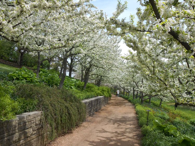 edged in white. A variety of flowering crabapples are in back.